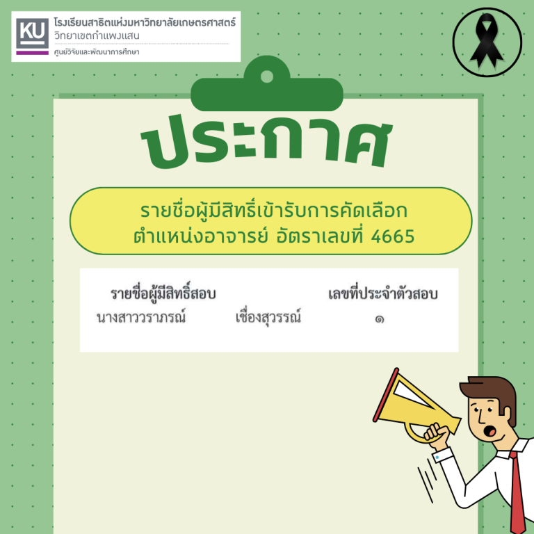 ประกาศรายชื่อผู้มีสิทธิ์เข้ารับการคัดเลือก ตำแหน่งอาจารย์ อัตราเลขที่ 4665 จำนวน 1 อัตรา